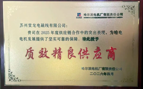 近日,百利装备集团所属苏州贯龙电磁线有限公司(以下简称“苏州贯龙”)受邀参加了哈电集团哈尔滨电机厂有限责任公司2026年度供应链大会。大会汇聚了哈电集团众多核心供应商,旨在共谋产业链协同发展。大会共遴选出十大优秀供应商进行表彰。苏州贯龙凭借其在质量管控与效率提升方面的突出表现,在众多供应商中脱颖而出,荣获“质效精良供应商”称号。此次获评,不仅是对苏州贯龙长久以来为客户提供高质效服务的肯定,更彰显其在质效管控方面的实力水平,是苏州贯龙全面贯彻落实百利装备集团融入央企产业链战略部署要求见行见效的具体体现。