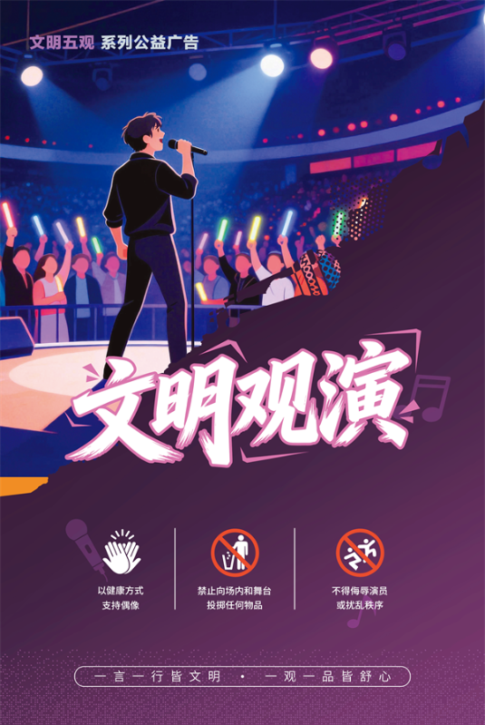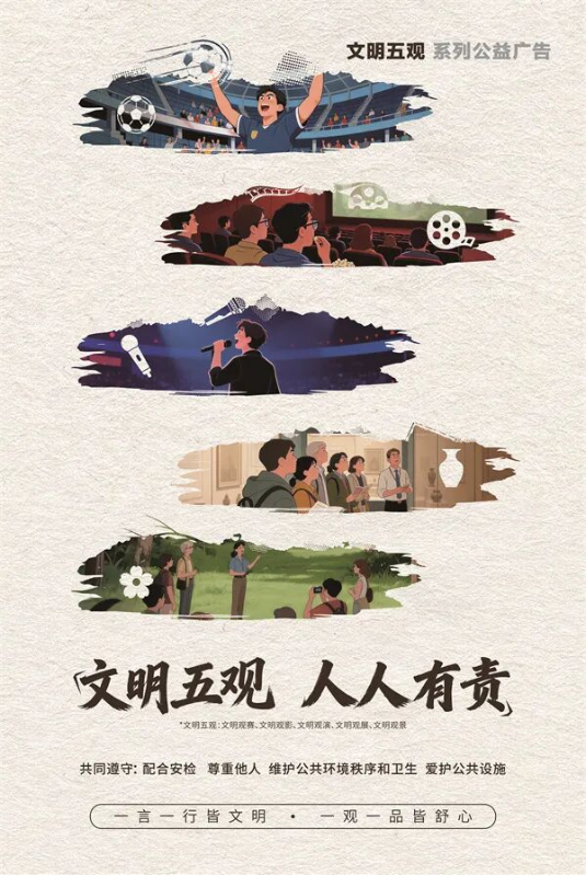》等法规,特别推出“文明五观”系列公益广告——观赛、观影、观演、观展、观景,以及一张“场景通则”。